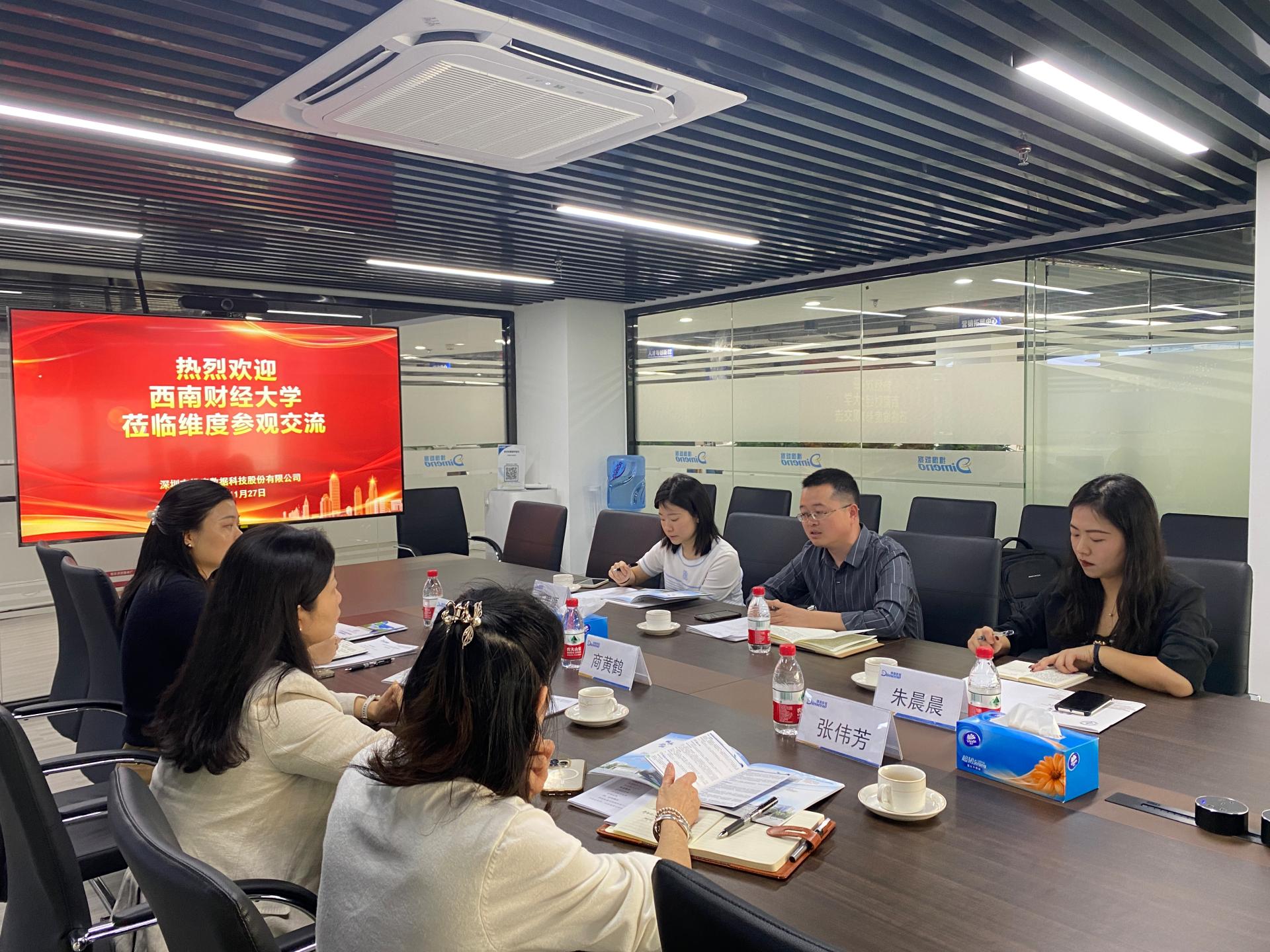 在与深圳市维度数据科技股份有限公司座谈交流中,公司总经理商黄鹤向学院介绍了企业发展规模、主营业务范围、未来愿景及目标定位,并表达了对于西南财大毕业生的高度认可,希望未来继续加强持续、深入、有效的校企合作。邹先云副书记向企业方汇报了统计学院发展概况、学科建设、学生规模及毕业生就业情况,双方进一步就学生短期实践、长期实习、人才培养、校园招聘等方面展开深入交谈。