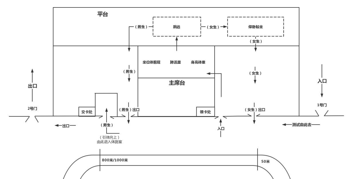 根据四川省教育厅和学校疫情防控相关文件精神,从严管控聚集活动。本次体测全部在晨曦运动场进行。具体地点及测试项目分布见流程图。