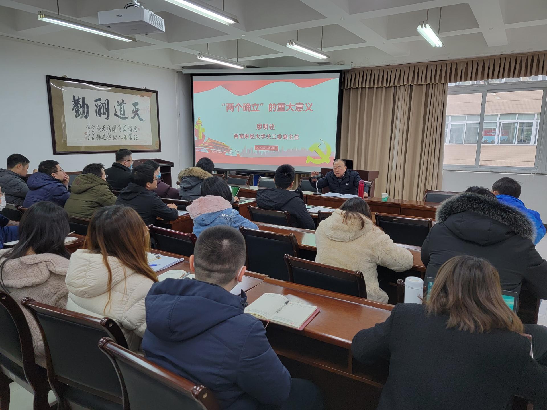 关工委副主任、原党委副书记廖明铨教授为统计学院和人文(通识)学院师生上了一堂专题党课,深刻领悟“两个确立”的重大意义。统计学院分党委书记黄海波主持党课。