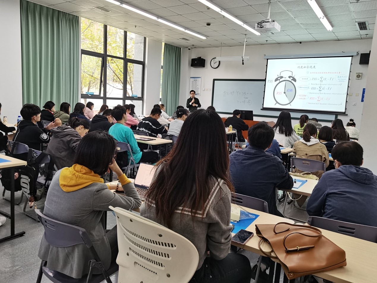 计量经济学课程作为统计学院全国精品建设课程,以及思政进课堂重点建设课程,一直受到学院领导和教师的高度重视,本次观摩研讨活动主要目的为考察思政进课堂情况,共同提高思想政治教育与计量经济学本科课程的融合,进一步提高教学质量。本堂课程主要讲授计量经济学中线性回归模型的拟合优度检验相关内容。在授课中,李伊老师从多个角度深入阐释了拟合优度的概念,并用直观例子形象地给同学们解释,并将拟合优度与“量变引起质变”的哲学思想相结合,鼓励同学持之以恒追求真理,为国家建设做出贡献。课程观摩后,参加本次活动的领导及教师就思政进课程情况,以及课程内容安排,授课进度,与学生的互动及教学模式等方面进行了讨论与交流,并与课后学生进行了沟通。