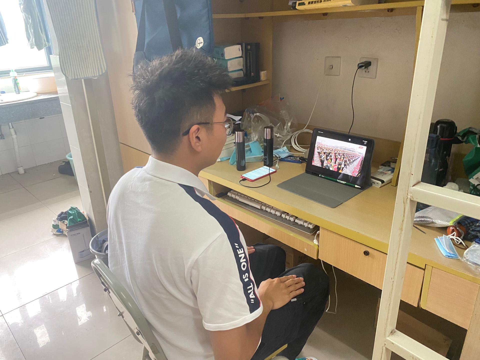 庆祝大会上,空中护旗梯队拉开飞行庆祝表演序幕,分别组成“100”和“71”字样的直升机、战斗机,呼啸而过的歼-20飞机和教练机,以及意志风发整齐划一的国旗护卫队都让全体师生激动不已。随后,全体师生聚精会神地聆听习近平总书记发表重要讲话并时时爆发出热烈的掌声。讲话中,习近平同志庄严宣告“我们实现了第一个百年奋斗目标,在中华大地上全面建成了小康社会,历史性地解决了绝对贫困问题,正在意气风发向着全面建成社会主义现代化强国的第二个百年奋斗目标迈进”,并郑重表示“谁妄想欺负中国必将碰得头破血流”,让全体师生感受到中国真正强起来了,不禁感叹党和人民的伟大以及作为中国人的自豪。100年风雨兼程,100年跌宕起伏,100年波澜壮阔,中国共产党从小到大,由弱到强,团结带领全国各族人民谱写了一个又一个奇迹,也让我们坚信在党中央的坚强领导下,中华民族伟大复兴的中国梦终将实现。最后,全体师生挥舞党旗,同天安门广场群众共同唱响《歌唱祖国》。