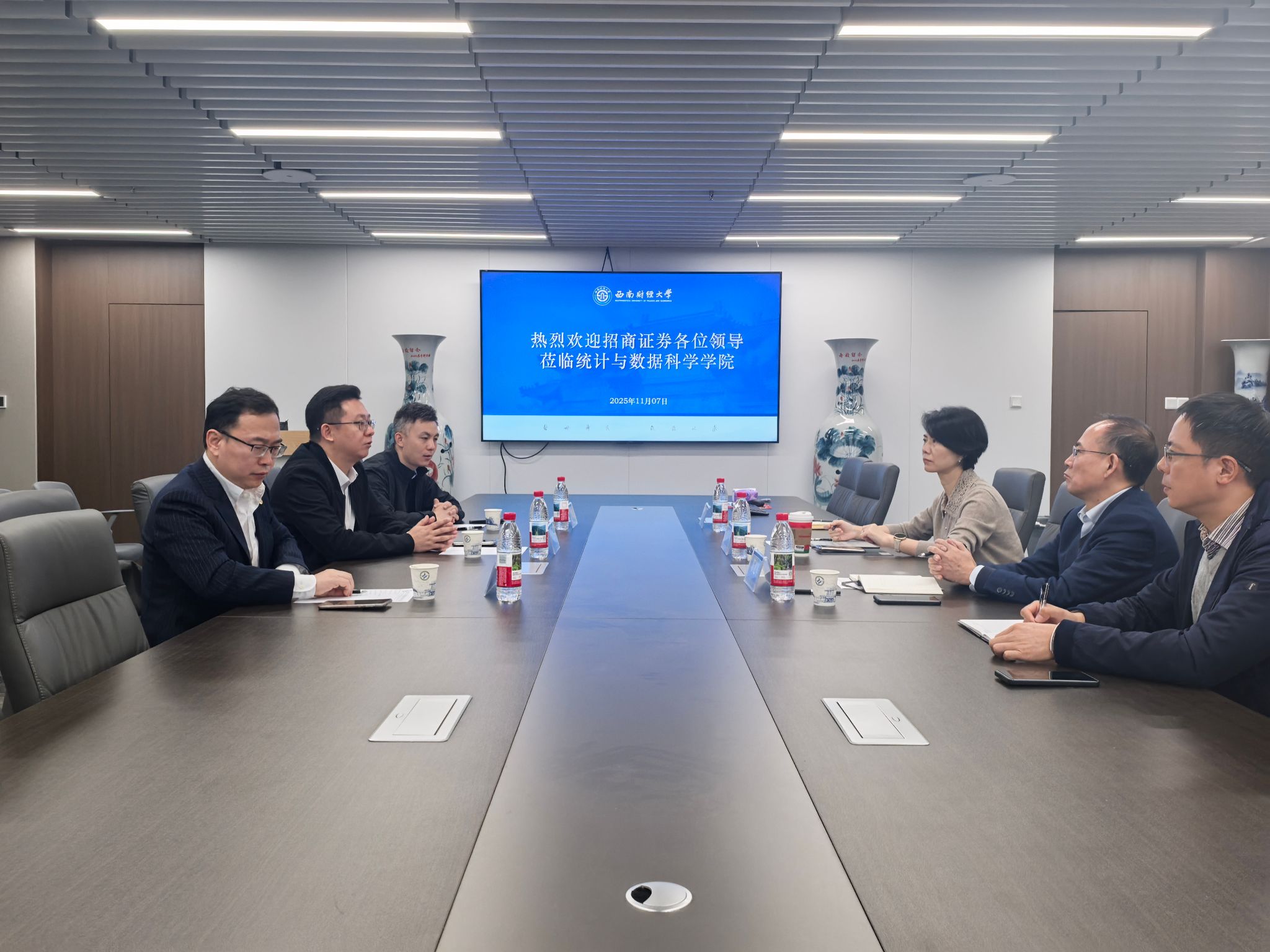会谈伊始,学院党委书记董春对招商证券投行委各位领导的到来表示热烈欢迎,同时对招商证券对统计人才的青睐表示衷心感谢,表达了在当前数智化时代,财经院校统计专业的人才培养,期待与行业有更多的互通互融。学院院长郭建军简要介绍了学院的历史沿革、学科建设、师资力量、学生就业等方面概况。学院期望通过与招商证券这样的头部企业合作,将前沿的理论教学与真实的行业实践相对接,精准赋能学生的专业培养与职业发展。