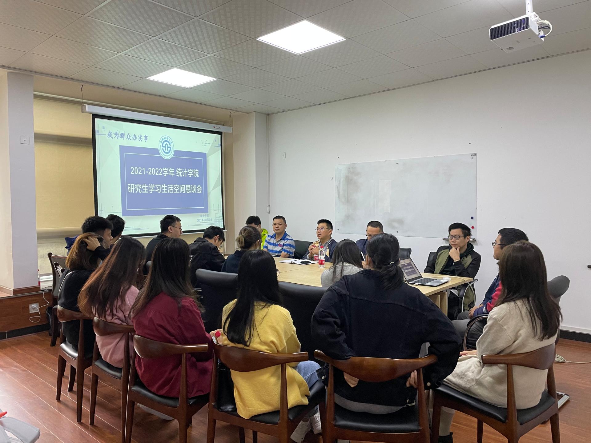 2021年10月12日,统计学院在通博楼B101会议室举行研究生学习生活空间恳谈会。统计学院领导班子成员、各系所教师代表以及学硕、科硕学生代表参与会议。会议由王思涯老师主持。