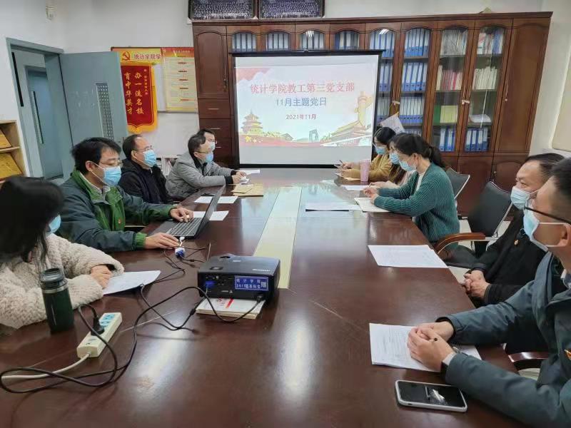 为扎实推进“两学一做”学习教育常态化制度化,在2021年11月16日,统计学院教工第三党支部召开“深入学习贯彻中国共产党第十九届中央委员会第六次全体会议精神”主题党日活动,活动由支部书记喻开志同志主持,全体党员参加并展开讨论。